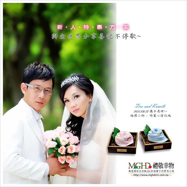 且同意謝卡能無償PO在 MGHD官網上與大家分享新婚喜悅,即可享有婚禮小物特優價格。